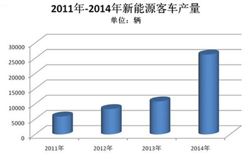 2014年,中國新能源客車產(chǎn)量為26217輛,比上一年增長1.42倍,2014年的產(chǎn)量超過了此前幾年生產(chǎn)的新能源客車總和。其中純電動(dòng)客車12904輛,比上一年增長6.54倍,插電式混合動(dòng)力客車13313輛,比上一年增長8.93倍,傳統(tǒng)混合動(dòng)力客車1193輛,比上一年減少86%。由于傳統(tǒng)混合動(dòng)力汽車被排除在新能源汽車之外,混合動(dòng)力客車產(chǎn)量也大幅萎縮,2014年的新能源客車的統(tǒng)計(jì)數(shù)據(jù)也沒有包括傳統(tǒng)混合動(dòng)力客車。