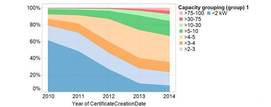 報(bào)告計(jì)算,澳大利亞安裝系統(tǒng)價(jià)格持續(xù)回落。截止2014年末,該國(guó)平均價(jià)格為每瓦1.60澳元(1.27美元)。