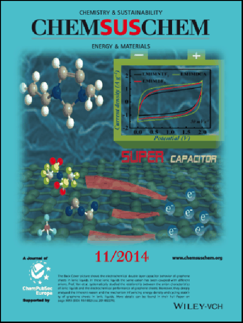 研究人員從高性能超級(jí)電容器用炭材料的微觀結(jié)構(gòu)要求和儲(chǔ)能機(jī)理出發(fā),開發(fā)出了具有超高比表面積和優(yōu)異電化學(xué)儲(chǔ)能特性的多孔炭納米棒電極材料(Science China Chemistry, 2014, 57, 1570-1578);以二維結(jié)構(gòu)石墨烯作為研究對(duì)象,系統(tǒng)研究了離子液體電解液的本征結(jié)構(gòu)對(duì)石墨烯電容的內(nèi)在影響機(jī)制,并建立了相應(yīng)的模型,研究結(jié)果發(fā)表在ChemSusChem(2014, 7, 3053-3062)上,并選為背封面。