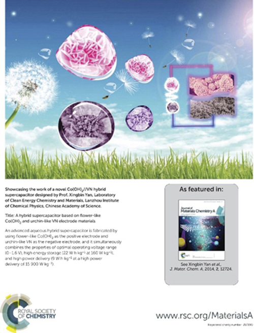 研究人員通過對(duì)雙金屬鎳-鈷氧化物形貌進(jìn)行調(diào)控,開發(fā)出了具有納米片層結(jié)構(gòu)的鎳鈷金屬氧化物,該電極材料展示了良好的電容特性和倍率特征;進(jìn)一步與自行研發(fā)的高比容多孔炭材料組配,組裝出兼具高能量密度和高功率密度水系不對(duì)稱電容器(Scientific Reports, 2014, 4, 3712)。為了進(jìn)一步提高不對(duì)稱電容器的體積能量密度,提出采用高密度的氮化釩材料替代低密度的多孔炭材料的思路,并開發(fā)出了高體積密度氮化釩-氫氧化鈷水系不對(duì)稱電容器,該研究結(jié)果被選為背封面發(fā)表在Journal of Materials Chemistry A(2014, 2, 12724-12732)上。