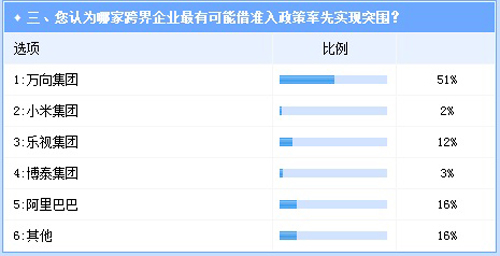 另外,已經分別與上汽和北汽兩大整車廠合作的國內互聯網巨擘阿里巴巴和樂視是另外兩個支持率在兩位數的企業,分別占比16%和12%。