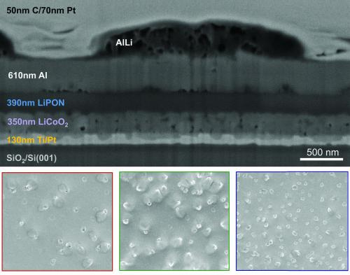 注:(頂部)鋁陽極全固態薄膜電池在循環之前的一個截面的掃描電子顯微鏡圖像。(底部)自上而下的掃描電子顯微鏡圖片顯示了在第一階段的循環過程中,鋁陽極表面的行為。通過增加充電電流,集群的密度同樣也會增加(紅色顯示的是充電50分鐘后呈現10 nanompas的效果,綠色是充電17分鐘后呈現20 nanoamps的效果,藍色是充電3分鐘后呈現30 nanoamps 的效果),表明鋁鋰合金的形成是一個動力驅動的過程。