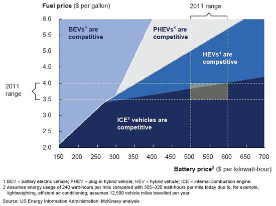 但這所謂的每千瓦時300美元,除了顯示電動車電池成本下降速度超乎預(yù)期外,是否還意味著電動車時代即將來臨呢?全球顧問公司麥肯錫(Mckinsey&Company)在2011年曾做了一張圖表,顯示不同的油價與電池價格情況下,純電動車、插電式混合電動車、油電混合車及一般汽車誰更具競爭力,灰色區(qū)塊的部分則是2011年的價格區(qū)間。從下圖圖表中可以看出,當(dāng)電動車電池價格位于每千瓦時約300美元左右時,就是電動車競爭力逐漸起飛的時刻。