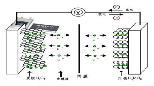 下面講講鋰離子電池的工作機(jī)理。這里不闡述氧化還原反應(yīng),化學(xué)基礎(chǔ)不好的,或者已經(jīng)把化學(xué)知識(shí)還給老師的人,看到這些專業(yè)的東西就會(huì)頭暈,所以我們還是搞點(diǎn)直白的描述。這里借用一張圖,這張圖比較容易讓人理解鋰離子電池的原理。