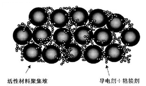 我們先看電池的正極,除了活性物質(zhì)之外,還有導(dǎo)電劑和粘結(jié)劑,以及用作電流載體的基體和集流體(正極通常是鋁箔)。粘結(jié)劑要把作為活性物質(zhì)的鋰金屬氧化物均勻的“固定”在正極基帶上面,導(dǎo)電劑則要增強(qiáng)活性物質(zhì)與基體的電導(dǎo)率,以達(dá)到更大的充放電電流,集流體負(fù)責(zé)充當(dāng)電池內(nèi)外部的電荷轉(zhuǎn)移橋梁。