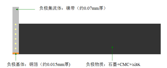 負(fù)極的構(gòu)造與正極基本相同,需要粘結(jié)劑來(lái)固定活性物質(zhì)石墨,需要銅箔作為基體和集流體來(lái)充當(dāng)電流的導(dǎo)體,但因?yàn)槭旧砹己玫膶?dǎo)電性,所以負(fù)極一般不添加導(dǎo)電劑材料。