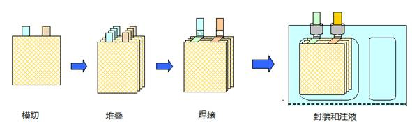 疊片工藝是將正極、負(fù)極切成小片與隔離膜疊合成小電芯單體,然后將小電芯單體疊放并聯(lián)起來(lái),組成一個(gè)大電芯的制造工藝,其大體工藝流程如下: