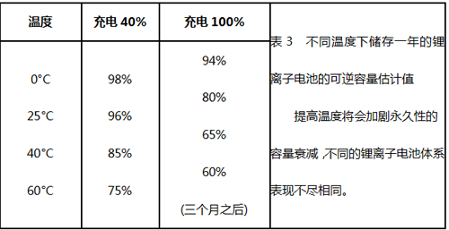 受熱或高充電電壓下也會使鋰離子電池承受更大的負擔,30℃(86°F)對于大多數(shù)鋰離子電池來說已經(jīng)算是較高溫度了,4.10V/電池以上的電壓為高電壓。將充滿電的電池暴露在高溫下較長時間比電池循環(huán)次數(shù)增加對鋰離子的壓力還要大。表3表示了容量損失與溫度的函數(shù)關系。