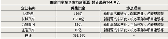 比亞迪汽車、長城汽車、力帆汽車以及江淮汽車四家自主車企,計(jì)劃通過募資形式發(fā)展新能源汽車產(chǎn)業(yè)。其中比亞迪募集資金最高,達(dá)到150億元,緊隨其后的是長城汽車計(jì)劃募集117.8億元,力帆汽車和江淮汽車分別計(jì)劃募資52億和45億元。