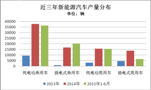2015年1-6月,插電式混合動(dòng)力乘用車生產(chǎn)2.04萬輛,同比增長4倍。插電式乘用車在所有新能源車型中增長速度最快。