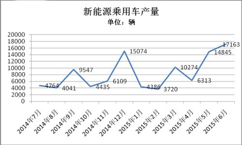 5月、6月的產(chǎn)量再次穩(wěn)固了對新能源乘用車市場的信心。5月生產(chǎn)14845輛,環(huán)比增長135%;6月生產(chǎn)17163輛,環(huán)比增長15.6%。至此,新能源乘用車2015年1-6月累計(jì)生產(chǎn)5.67萬輛,已超過去年全年5.45萬輛的產(chǎn)量。