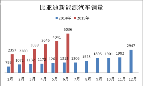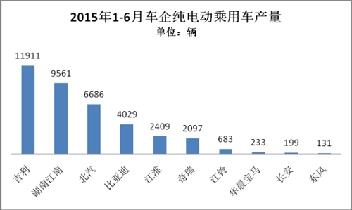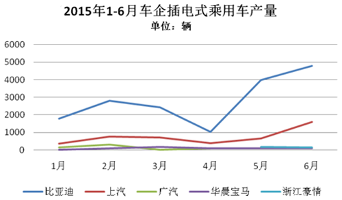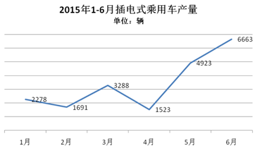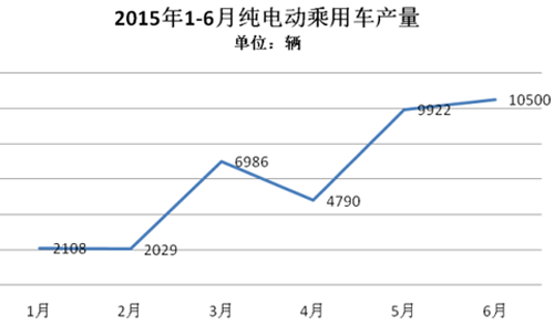 2015年1-6月,純電動(dòng)乘用車生產(chǎn)3.63萬輛,接近去年全年3.78萬輛的產(chǎn)量,同比增長3倍。