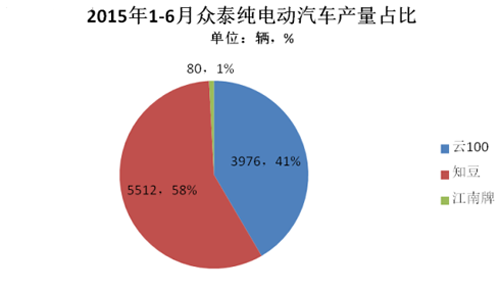 眾泰2015年1-6月生產(chǎn)電動(dòng)汽車9568輛。旗下主推的車型有眾泰知豆和云100,另外以江南奧拓為原型打造的電動(dòng)汽車也開始生產(chǎn)。