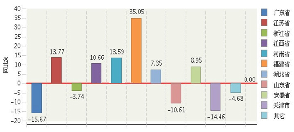 2015 年1~5 月全國電池行業主營業務收入同比增長較快的地區是福建、江蘇、河南、江西地區。(參見圖10)