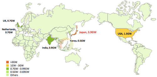 上半年英國需求在年初搶裝潮褪去后大幅萎縮,取而代之的印度則成為成長最明顯的市場,并躍居中國組件三大主要出口國之一。根據(jù)TrendForce旗下新能源事業(yè)處EnergyTrend最新報告指出,2015年上半年中國光伏組件出口約12GW(中國內(nèi)需除外),其中最主要的三大海外市場分別為日本、美國與印度,出口合計超過6GW。