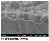 圖2是300周循環(huán)后硅薄膜的SEM圖,從中可以看到循環(huán)后膜變得較松散,表面粗糙、不規(guī)則,厚度增至6μ左右,體積膨脹了近300%。