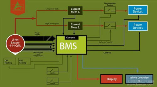 電池組中有一個叫做VITM (voltage current temperature module)的裝置,實時測量每一個單電池的電壓電流和溫度,保證并且通過一系列電阻和晶體管來調節對于一個單電池的使用量,同時給溫度管理系統傳達指令,調節冷卻劑的流量和溫度,給電池降溫和升溫。