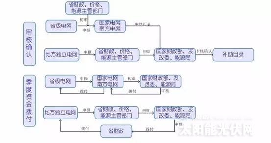 通過并網(wǎng)驗收后的分布式光伏發(fā)電項目逐級向經(jīng)同級財政、價格、能源主管部門審核后逐級上報。電網(wǎng)匯總后上報財政部、國家發(fā)展改革委、國家能源局對報送項目組織審核,并將符合條件的項目列入補助目錄予以公告。
