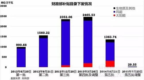 不多說直接上圖,這是最新的補助目錄發(fā)放情況,若不計2015年7月下發(fā)的第五批調(diào)整目錄,補助目錄已經(jīng)1年沒有更新。從裝機容量來看,已列入目錄的太陽能及風能項目合計8118萬千瓦,然而截2015至6月末,太陽能及風能項目合計14069萬千瓦,意味著約有5000多萬千瓦的項目因沒有列入目錄而拿不到補貼。(全國并網(wǎng)風電裝機容量10491萬千瓦,全國光伏發(fā)電裝機容量3578萬千瓦,光伏電站3007萬千瓦,分布式光伏571萬千瓦。)
