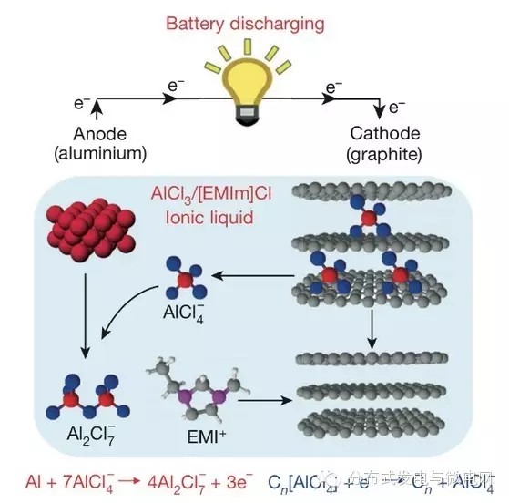 圖中展示了鋁電池中AICI4-離子是如何從石墨的陰極穿梭到鋁的陽極從而產(chǎn)生放電電流。