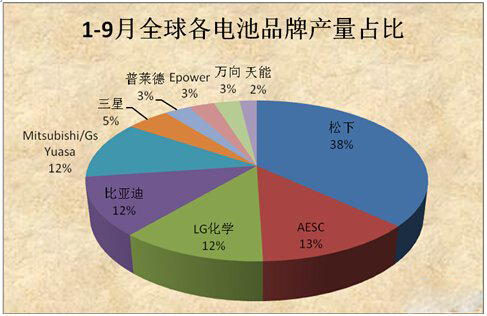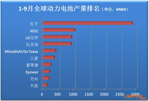 2015年1-9月,全球動力電池產(chǎn)量排行榜中,松下以2875MWH的總產(chǎn)量遙遙領(lǐng)先第二名1800多MWH,排名第二的AESC前9個月累計產(chǎn)量為1023MWH,LG化學緊隨其后,今年累計產(chǎn)量為916MWH,而自主品牌比亞迪順利進入前四位,累計產(chǎn)量達902MWH。Mitsubishi和GsYuasa的產(chǎn)量為404MWH,三星緊隨其后,累計產(chǎn)量為359MWH。另外,我國的普萊德、萬向和天能的電池品牌均進入榜單前十,累計產(chǎn)量分別為249MWH、191MWH和125MWH。