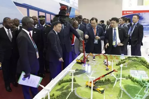 此次中非裝備制造業(yè)展共有來自電力,鐵路和軌道交通、工程機械、金融、航空等領(lǐng)域的43家中國優(yōu)秀企業(yè)參展。中國中車、三一聯(lián)合展臺成為習(xí)近平及非洲各國政要停留觀看僅有的兩家中企展臺。習(xí)近平與三一集團總裁唐修國等參展企業(yè)負(fù)責(zé)人親切握手,并仔細(xì)觀看展臺上的“埃塞阿達瑪二期風(fēng)電項目”。參展企業(yè)負(fù)責(zé)任人向習(xí)近平匯報說,“埃塞阿達瑪二期風(fēng)電項目”由三一集團、中地海外、中國電建聯(lián)合建設(shè),是埃塞俄比亞最大風(fēng)電場,也是非洲第二大風(fēng)電項目。該項目有效帶動了中國風(fēng)電制造產(chǎn)能的轉(zhuǎn)移,,提升了埃塞可再生能源產(chǎn)業(yè)的工業(yè)化水平,為中國產(chǎn)品在非洲得到認(rèn)可,促進中國與非洲地區(qū)產(chǎn)能合作,實現(xiàn)非洲制造提供了強有力的保障。習(xí)近平頻頻點頭,走到沙盤前,指著正在模擬運轉(zhuǎn)的風(fēng)電項目,對身邊的南非總統(tǒng)祖瑪及非洲各國政要說,這是我們中國在埃塞承建的風(fēng)電項目,為非洲帶來清潔能源。南蘇丹總統(tǒng)基爾等非洲多國政要對該風(fēng)電項目表達了濃厚的興趣,并上前了解項目設(shè)備、施工等情況。