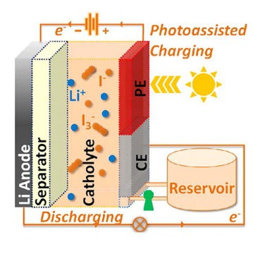 水性電解質與電池的反電極和太陽能電池的染料敏化光電極接觸。給電池充電時,要將其暴露于陽光下,陽光會使電解液中的染料分子為光電極提供電子,降低電池充電所需能量。