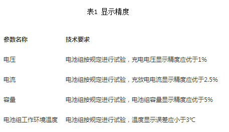 a、顯示精度。電池組配有專用電池管理系統(BMS),BMS顯示的各種參數值與電池組實際的參數值之間的誤差應符合表1的要求。