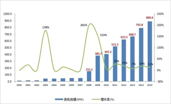 圖3:中國儲能項目累計裝機規模(2000-2015)