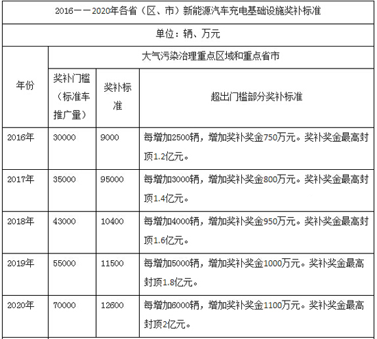 大氣污染治理重點區(qū)域和重點省市(包括北京、上海、天津、河北、山西、江蘇、浙江、山東、廣東、海南),2016-2020年新能源汽車(標準車)推廣數(shù)量分別不低于3.0萬輛、3.5萬輛、4.3萬輛、5.5萬輛、7萬輛,且推廣的新能源汽車數(shù)量占本地區(qū)新增及更新的汽車總量比例不低于2%、3%、4%、5%、6%。