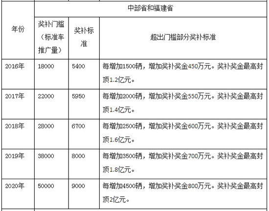 中部省(包括安徽、江西、河南、湖北、湖南)和福建省,2016-2020年新能源汽車(標準車)推廣數(shù)量分別不低于1.8萬輛、2.2萬輛、2.8萬輛、3.8萬輛、5.0萬輛,且推廣的新能源汽車數(shù)量占本地區(qū)新增及更新的汽車總量比例不低于1.5%、2%、3%、4%、5%。