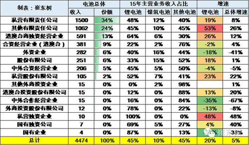 鋰電池行業的高增長主要是其他有限責任公司和港臺企業的表現很強,收入高增長。而國企性質的企業在新能源產業是較差的,沒有有效的產品投入。未來國企大汽車集團可能有錢投資,但與民營相對的體制差距太大,估計也是很難發展。