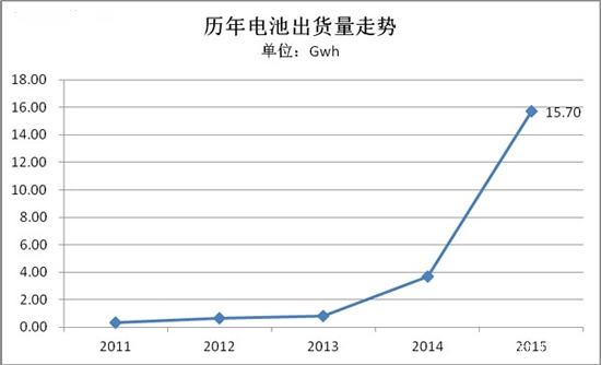 2015年新能源汽車產(chǎn)量達37.9萬輛,伴隨其爆發(fā)式增長,電池出貨量也呈現(xiàn)較強走勢。從近5年動力電池走勢看,2014年之前,電池產(chǎn)量都低于1GWh,產(chǎn)量僅維持小幅增長。直到2014年動力電池出現(xiàn)小幅提升,達3.7GWh,再到2015年攀升至15.7Gwh,同比增長3倍之多。政策紅利激活私人消費市場,拉動新能源汽車爆發(fā)式增長,使得電池整體出貨量劇增。(注釋:以下動力電池數(shù)據(jù)源于新能源汽車產(chǎn)量與其搭載的電池容量乘積。由于未考慮其他影響因素,總體實際產(chǎn)能會略高于此。電池產(chǎn)量計算公式:車型搭載電池容量*車型產(chǎn)量)