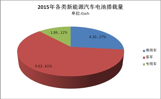 細分不同車型看,源于新能源客車對電池需求本身就高于其他車型,外加2015年各大車企追逐政策紅利,對新能源客車的產(chǎn)能傾斜(尤其是6-8米純電動客車),使得新能源客車搭載電池量依舊占據(jù)市場主力,達9.63Gwh,占全年總電池產(chǎn)量的61%;對應(yīng)新能源乘用車搭載電池量為4.2Gwh,占比總量的27%;純電動專用車搭載電池量達1.86Gwh,占比僅10%。