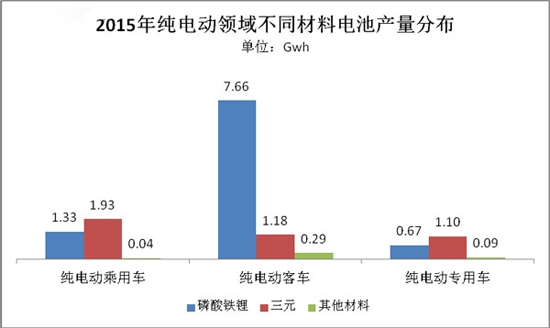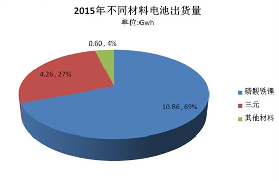根據(jù)不同電池材料看,2015年磷酸鐵鋰電池出貨量達10.86Gwh,占據(jù)市場近69%份額;對應(yīng)三元材料電池出貨量為4.26Gwh,占比27%;而對應(yīng)錳酸鋰、鈦酸鋰、超級電容、鎳氫電池等其他材料電池出貨量僅0.6Gwh,占比4%。