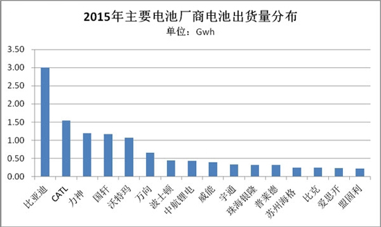 分電池廠商看,2015年全年出貨量超過1Gwh的廠商僅5家:比亞迪、寧德新時代(CATL)、力神、合肥國軒高科、沃特馬。5家廠商累計電池出貨量達8Gwh,占比總量的近5成。