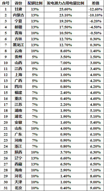 然而,哪些省份是買方?哪些省份是賣方?下表為“國(guó)家給各省的可再生能源配額”、“在不限電的情況下,各省風(fēng)電、光伏可能的發(fā)電量占用電量的比例”以及兩者之間的差額。