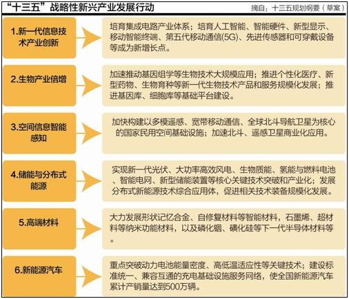 與“十二五”相比,“十三五”規劃綱要(草案)將戰略性新興產業的范圍由節能環保、新一代信息技術、生物、高端裝備制造、新能源、新材料、新能源汽車等七類調整為新一代信息技術產業創新、生物產業倍增、空間信息智能感知、儲能與分布式能源、高端材料、新能源汽車六大領域實施戰略性新興產業發展行動(詳見圖表)。